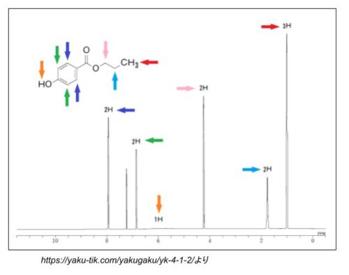 NMR スペクトルの横軸は、化学シフトと呼ばれる 単位が ppm の指標を使います。これは基準物質との遮蔽度を比較した値です。基準物質(=右端の 0ppm を表す物質)として用いられるのは、一般的に テトラメチルシラン(Si(CH3)4:TMS) です。以下、1H-NMR データの 1 例
