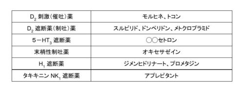 代表的な催吐、制吐薬をまとめると、以下の表になります。